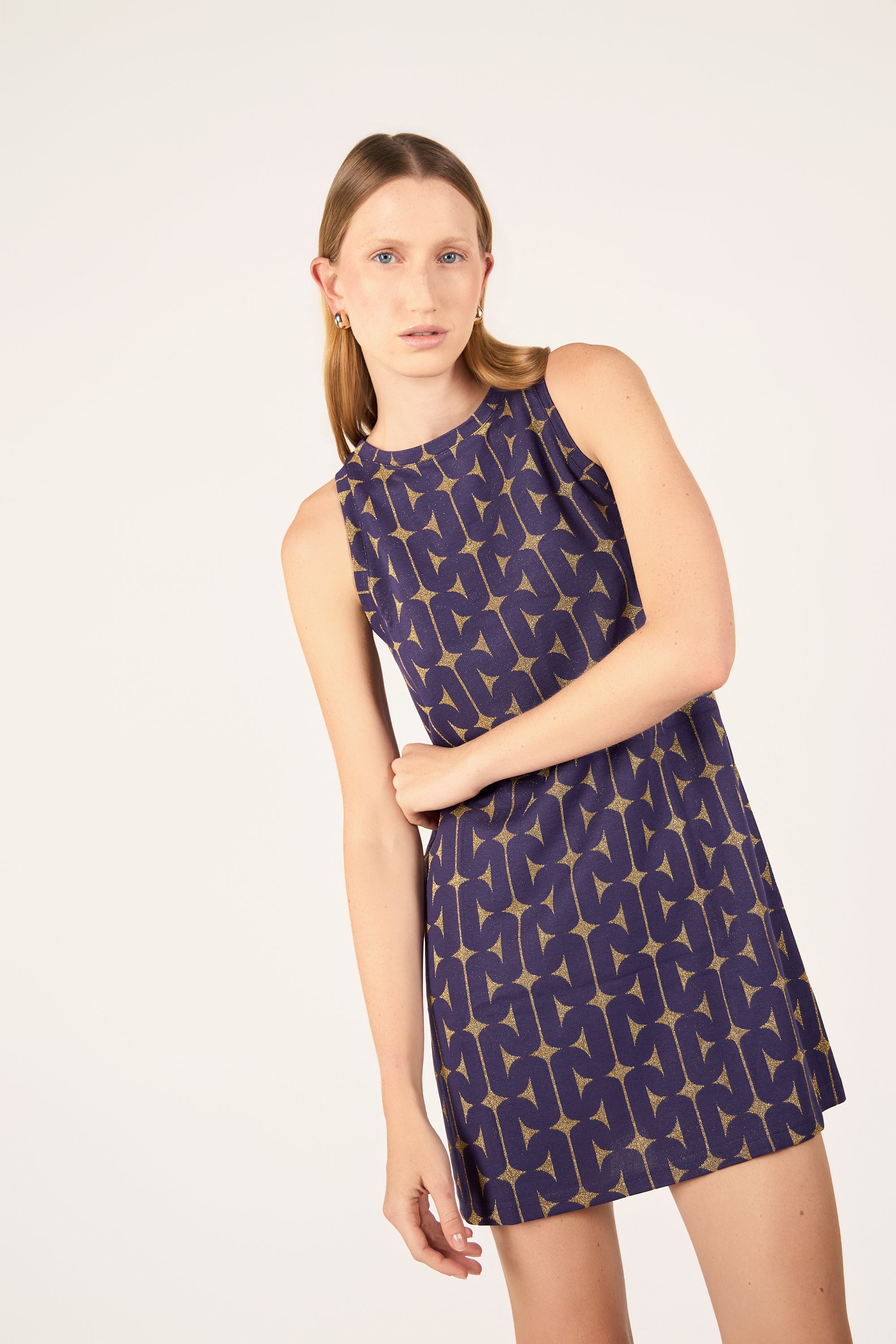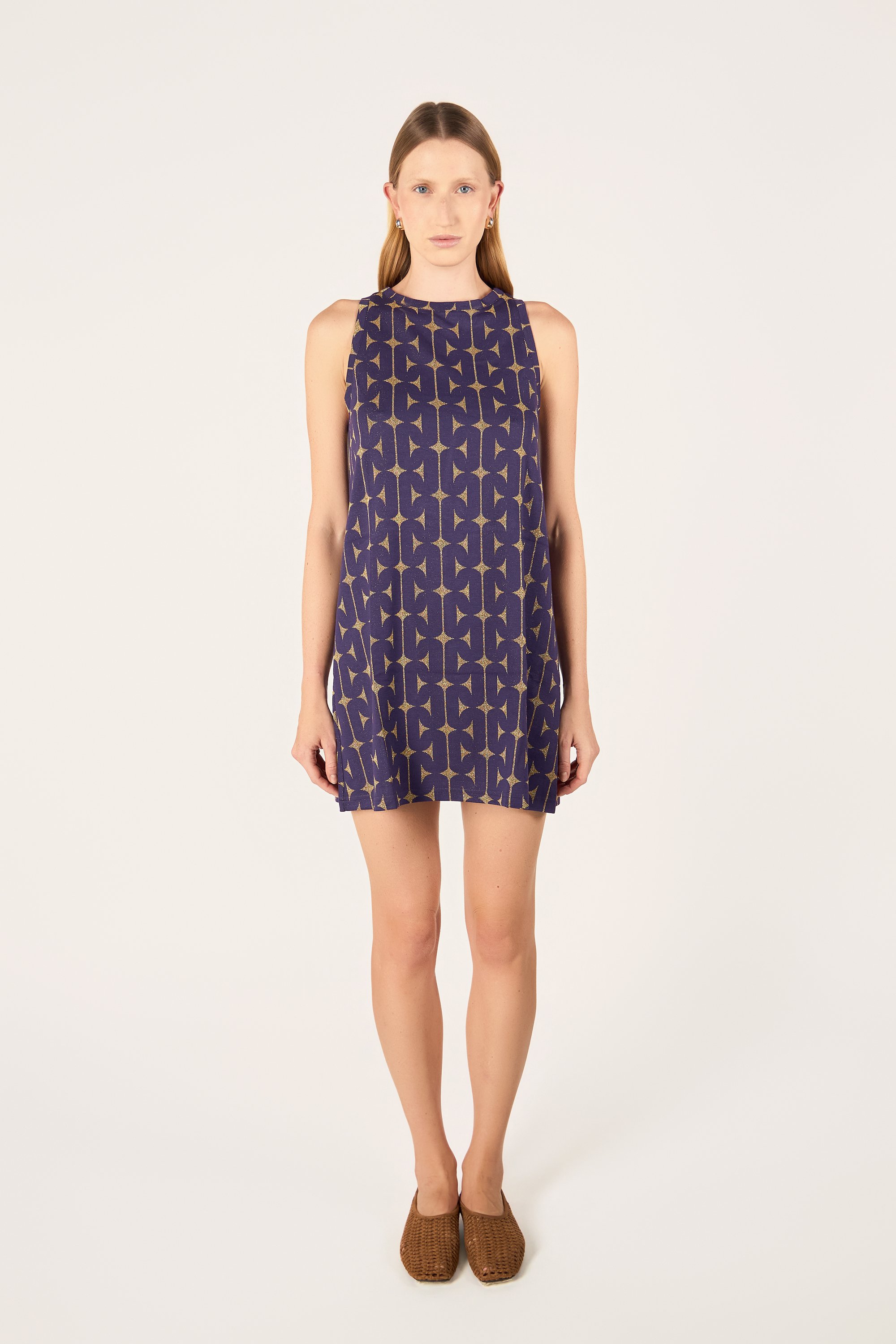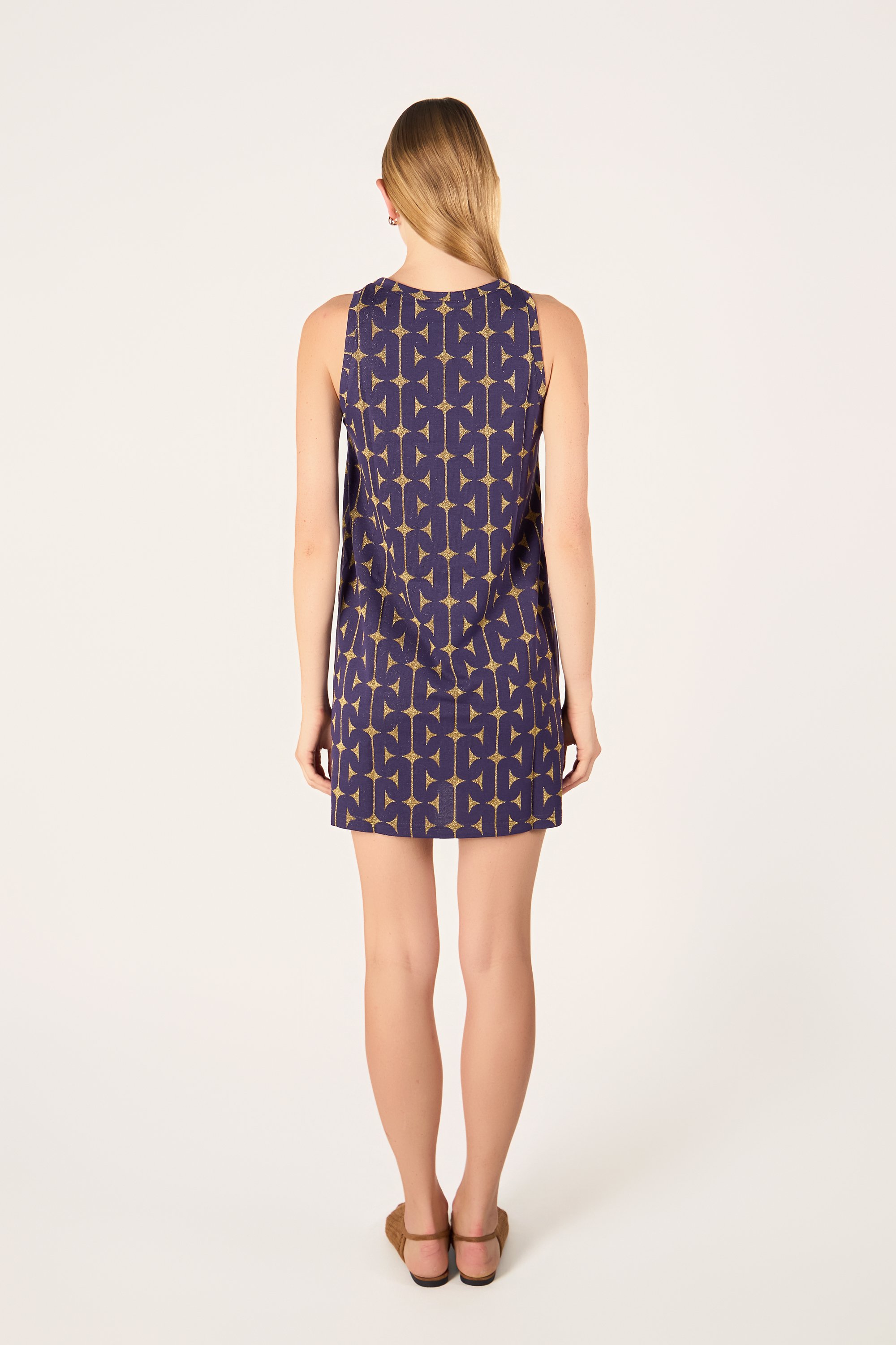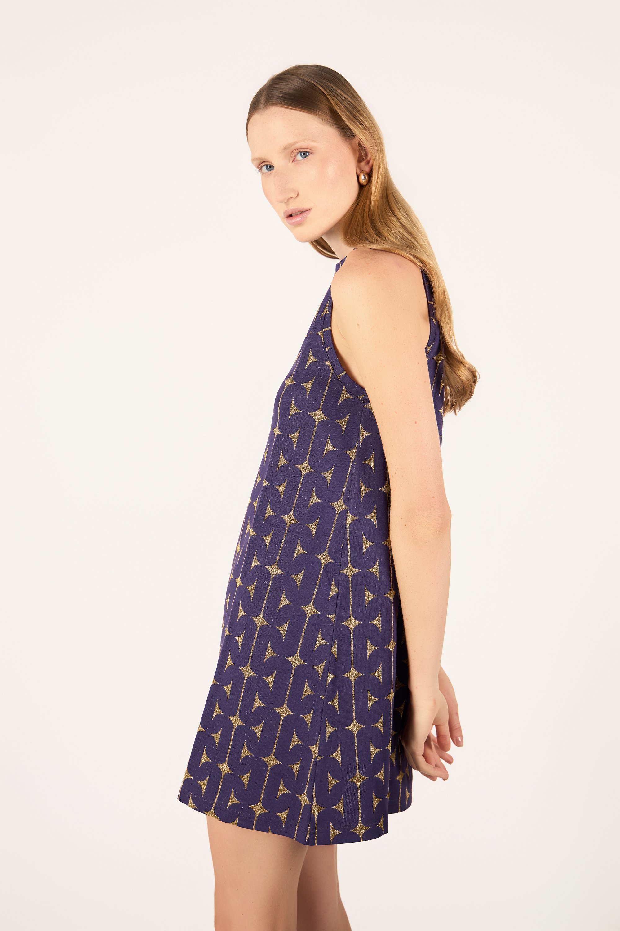 Abito corto ad A con scollatura americana.