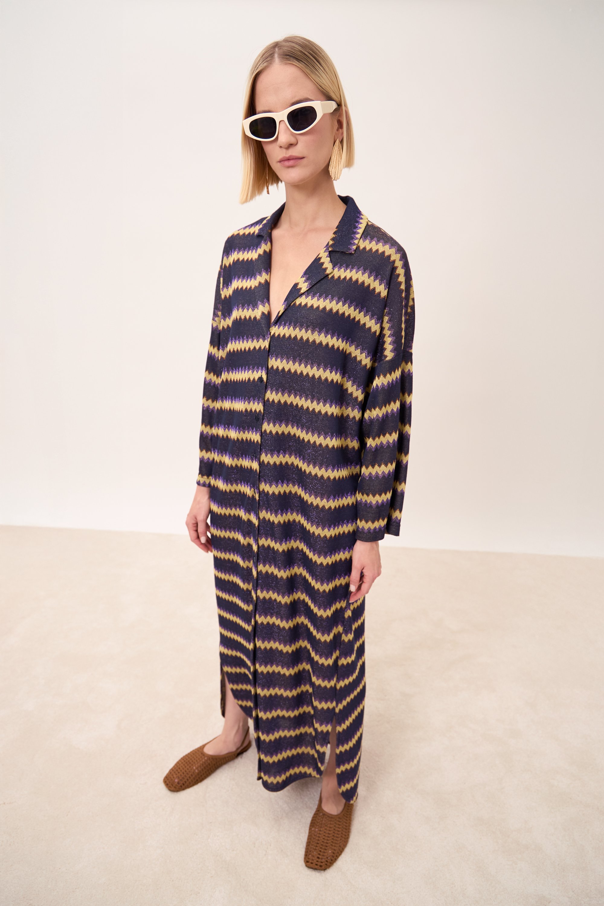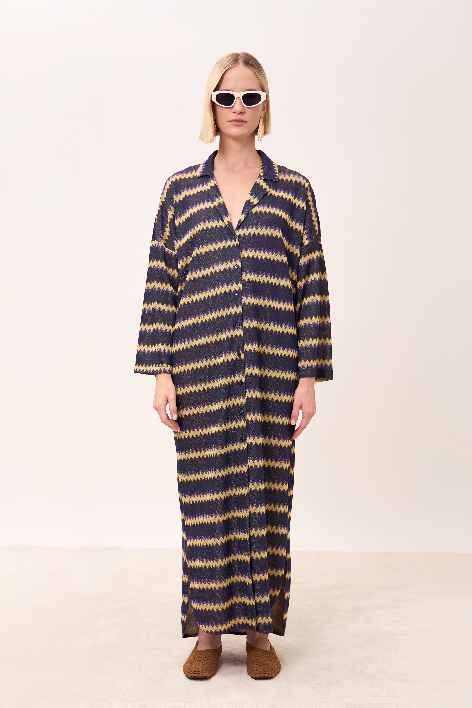Caftano con maniche ampie a 3/4. Scollo reverse. Apertura frontale abbottonata. Spacchi laterali.