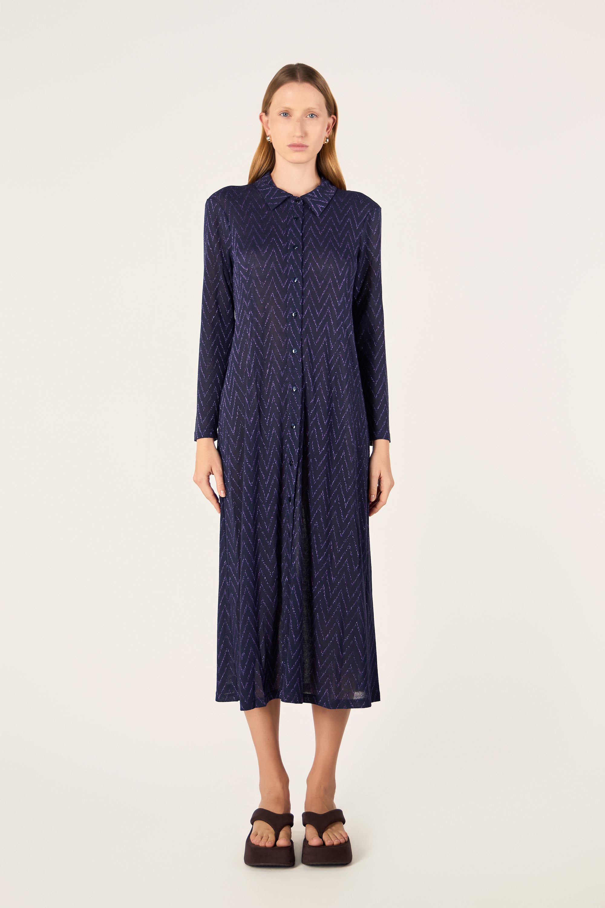 Abito chemisier lungo. Chiusura frontale con bottoni. Leggermente sfiancato.
