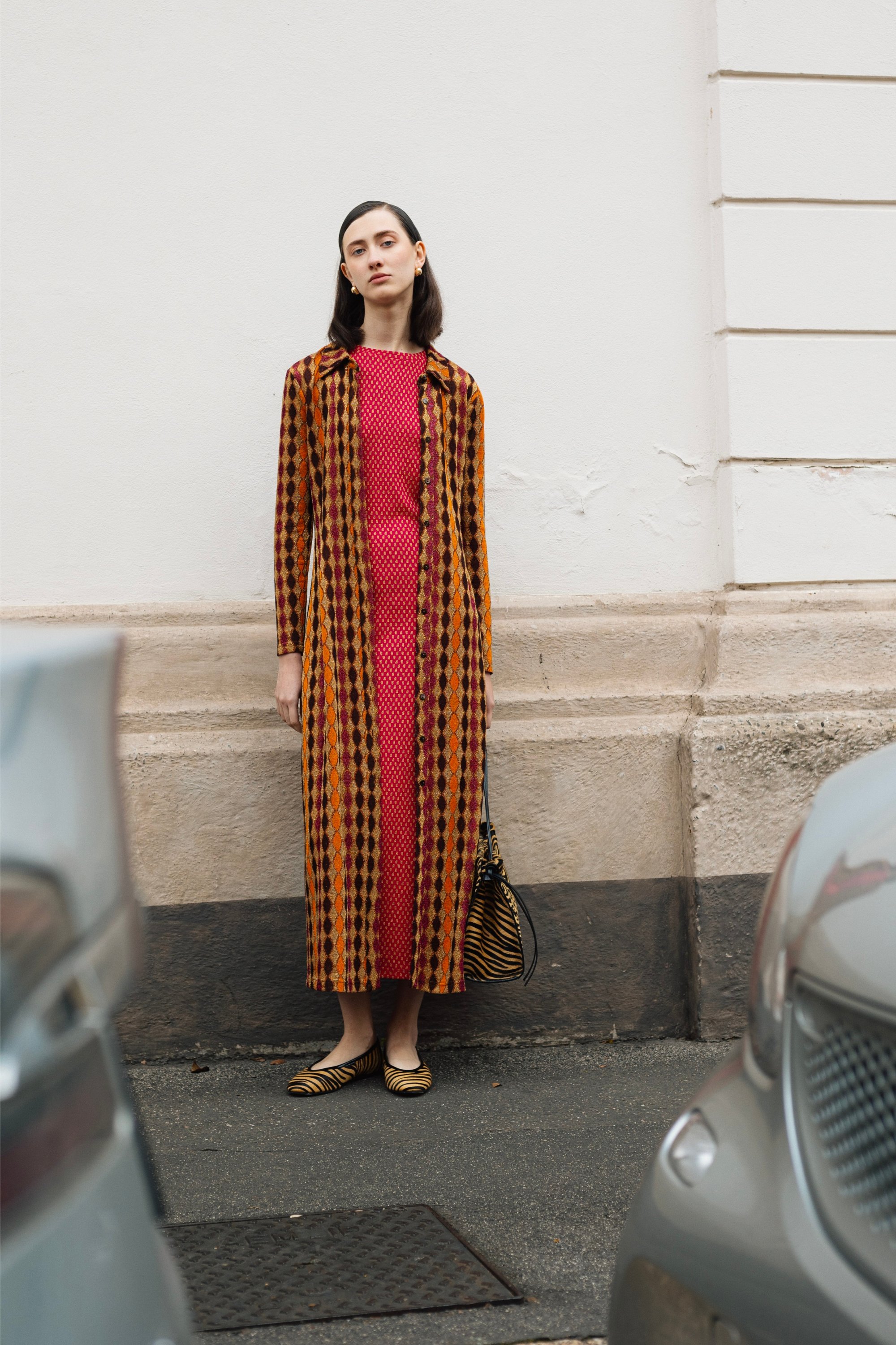 Abito chemisier lungo. Chiusura frontale con bottoni. Leggermente sfiancato.