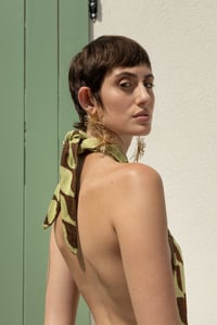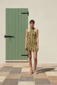 Abito corto aderente con oblò. Top con fasce che incrociano sul seno regolabile con fiocco. Schiena nuda.