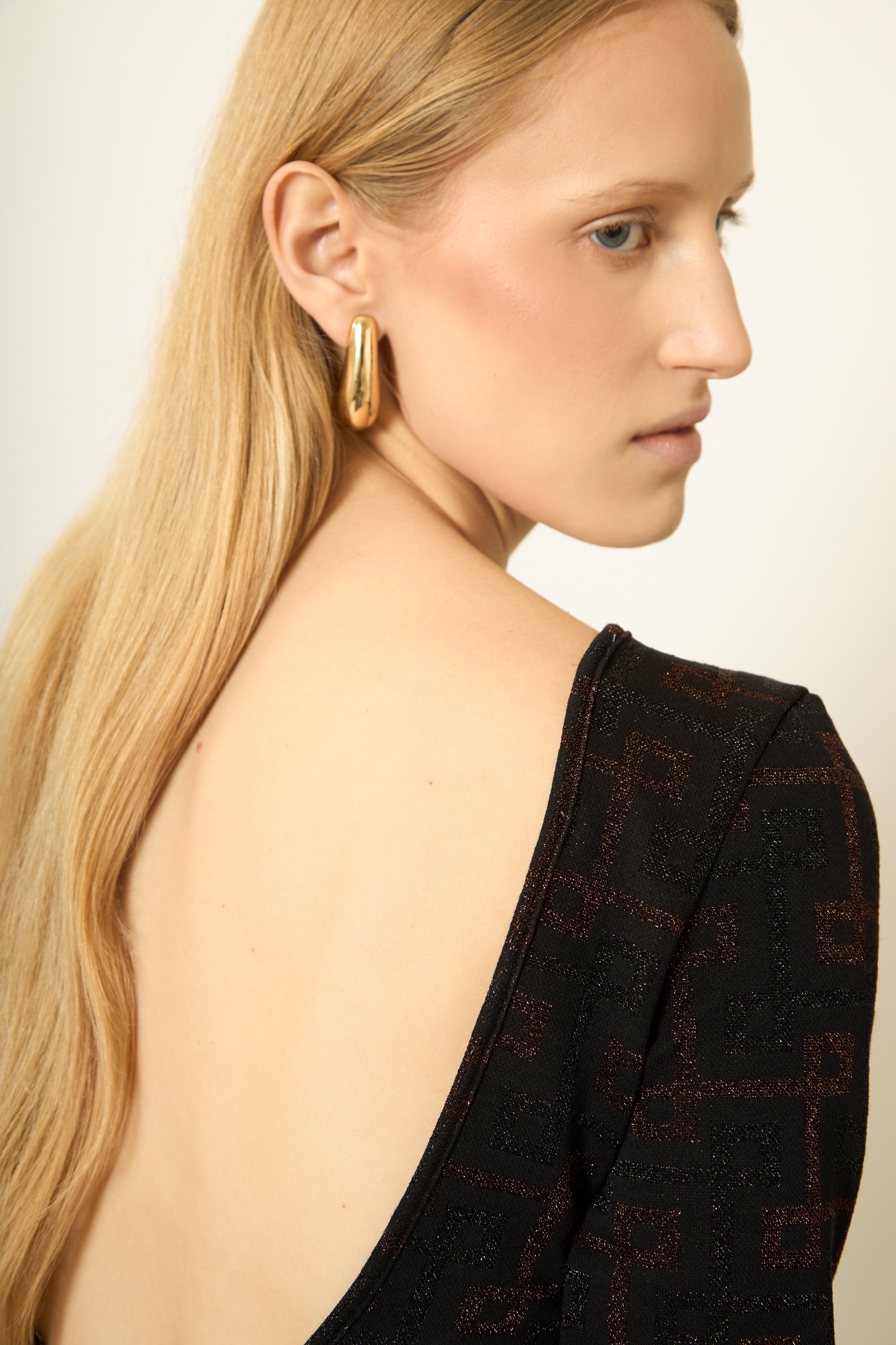 Abito lungo con scollo rotondo profondo sulla schiena. Manica lunga aderente. Gonna con spacco sul centro dietro.