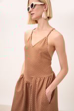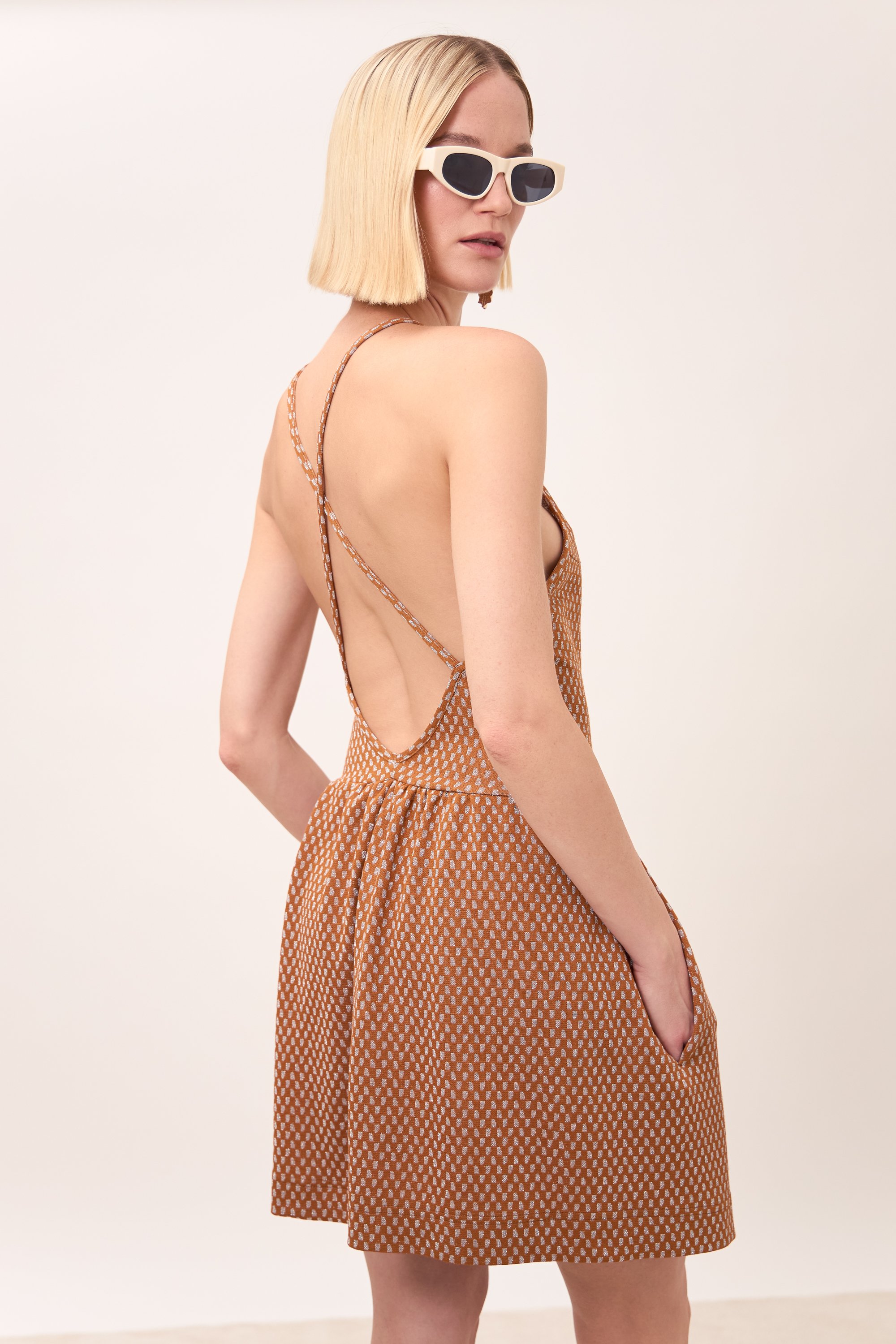 Profonda scollatura incrociata sulla schiena. Tasche.