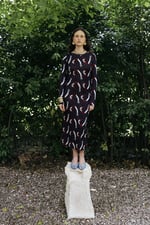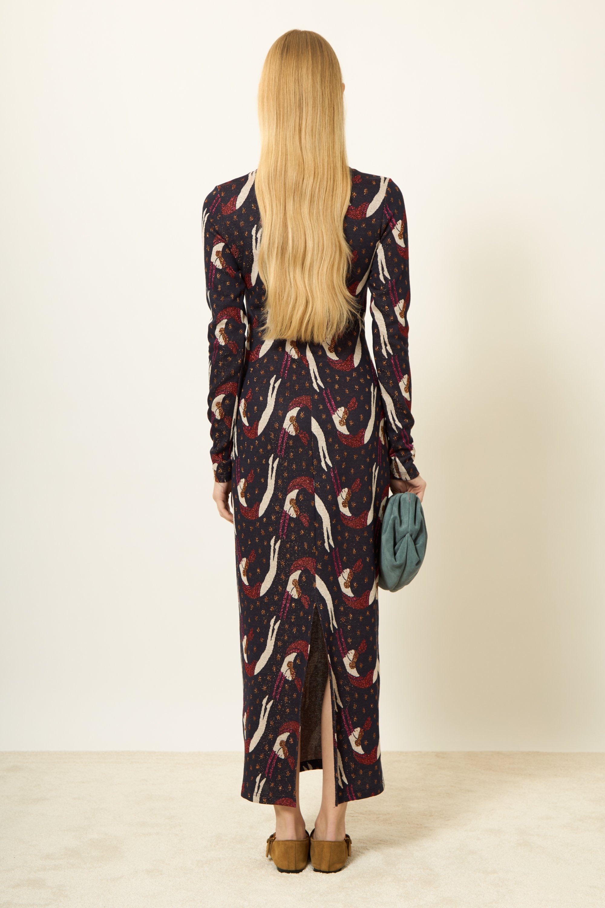 Abito midi a tunica, sfiancato, girocollo e maniche strette lunghe. Spacco sul centro dietro.