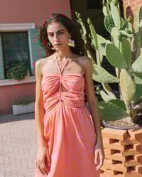 Abito lungo con buchi ed incroci che si allaccia dietro al collo. Schiena scoperta.