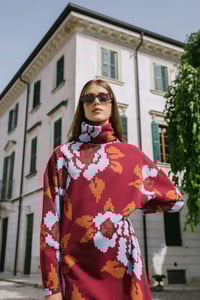 Abito midi ampio con maniche lunghe e collo alto morbido.