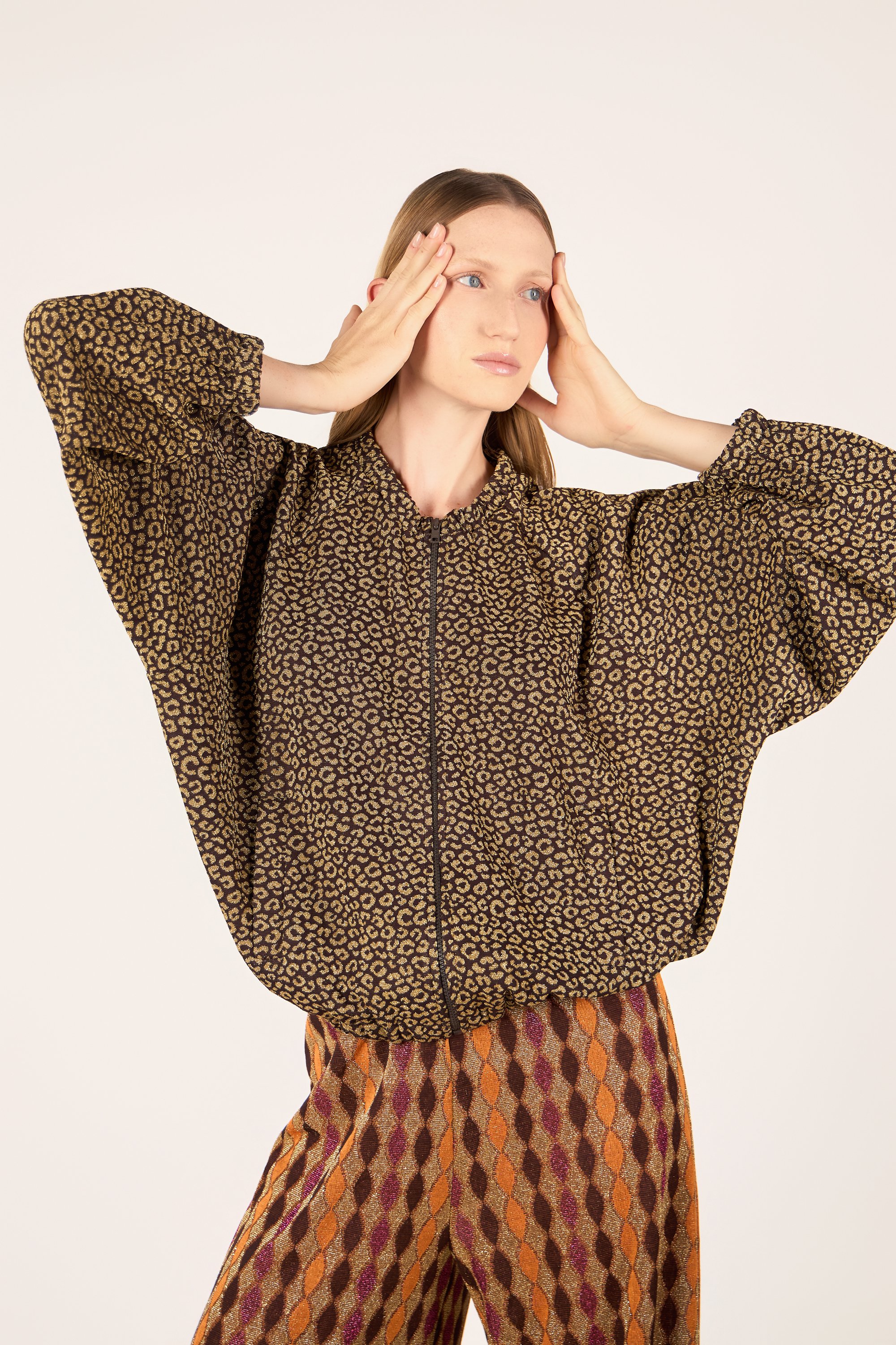 Bomber molto ampio crop. Tasche a filetto. Chiusura con zip. Elastico sui polsi, in vita e sul collo.