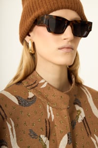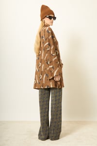 Giacca kimono con colletto coreano. Abbottonatura frontale nascosta. Zip sui fianchi per aprire due spacchi. Tasche applicate. Tessuto jacquard fantasia base VISCOSA.