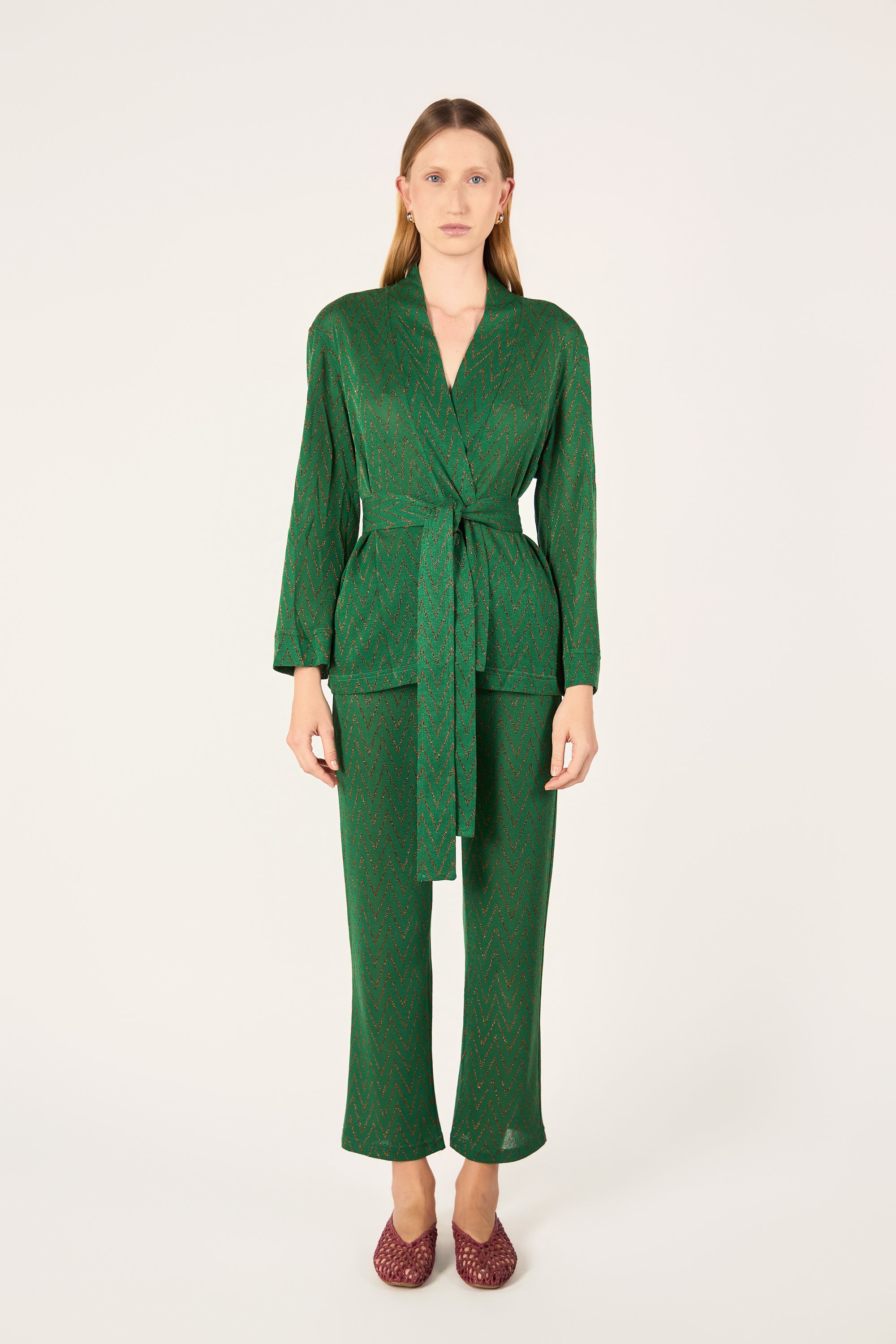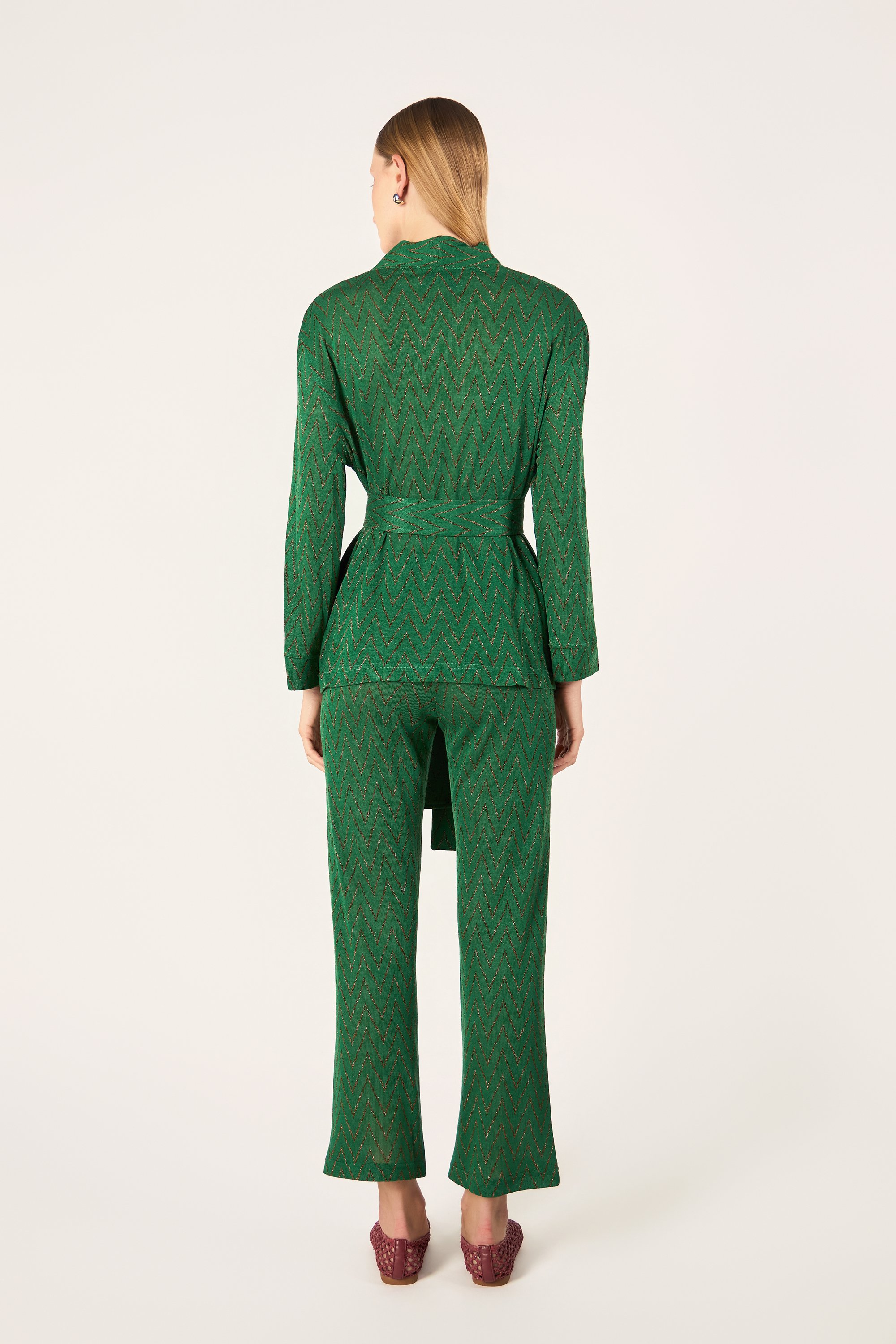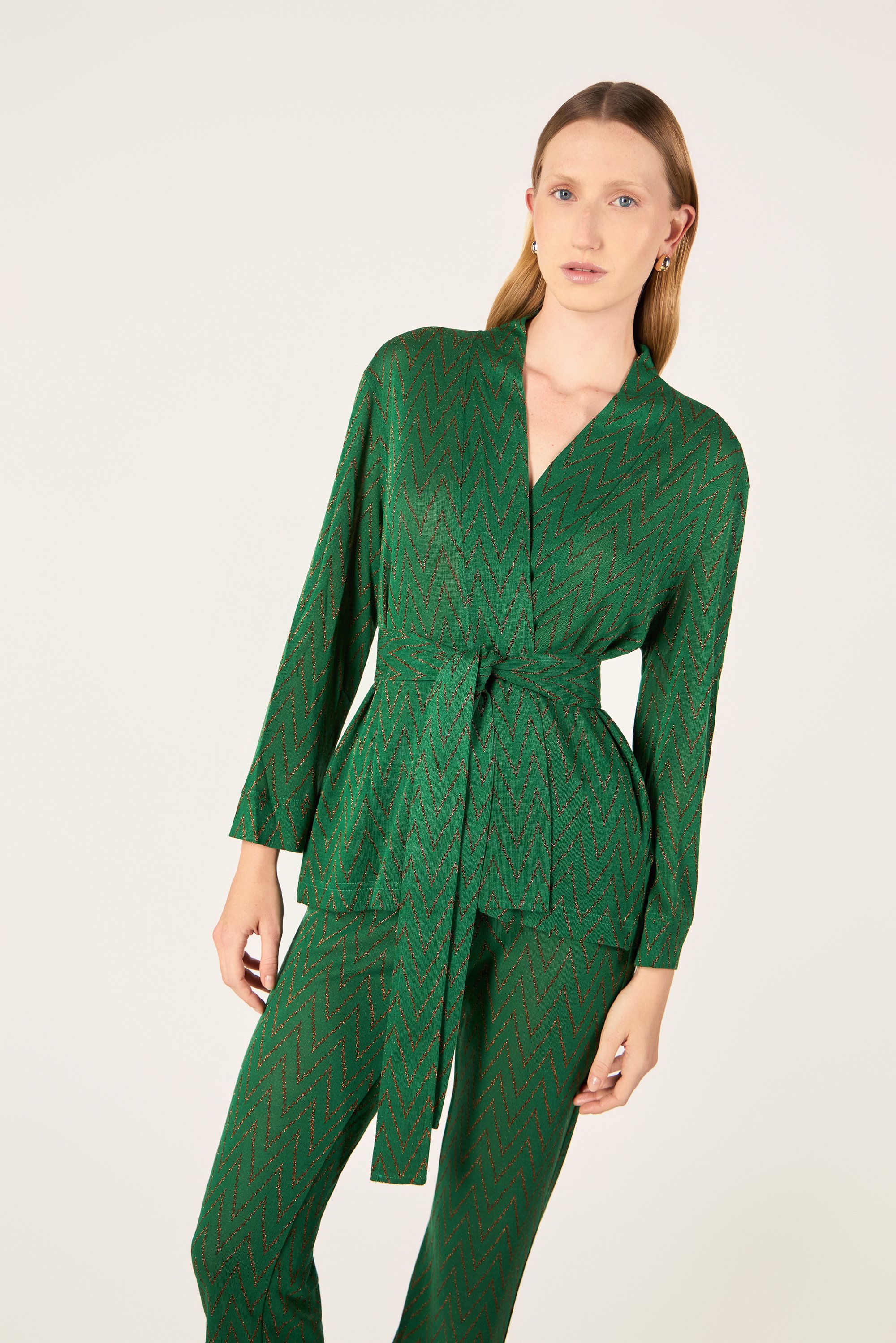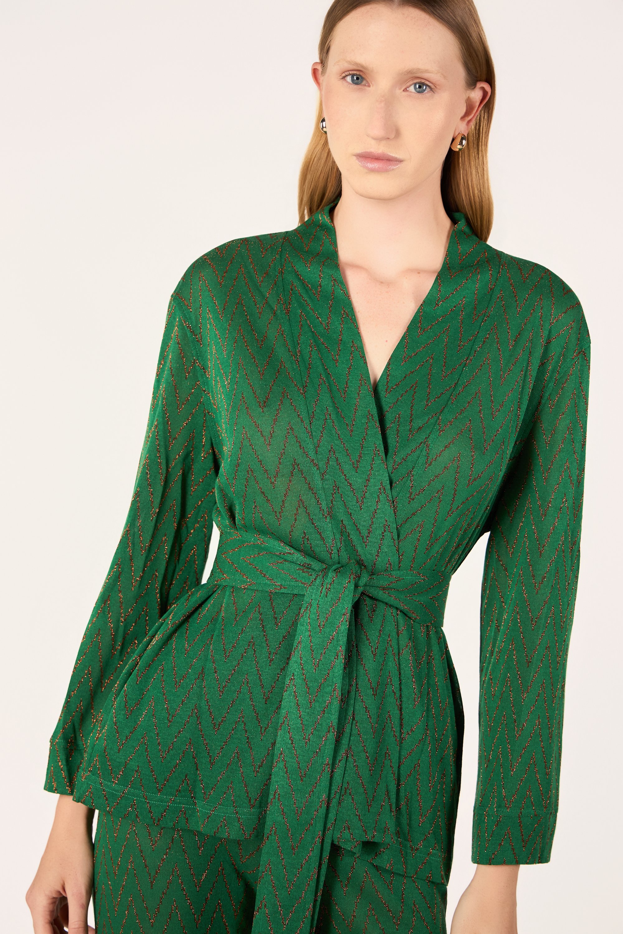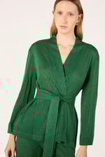 Cardigan corto con maniche lunghe. Chiusura frontale con cintura.