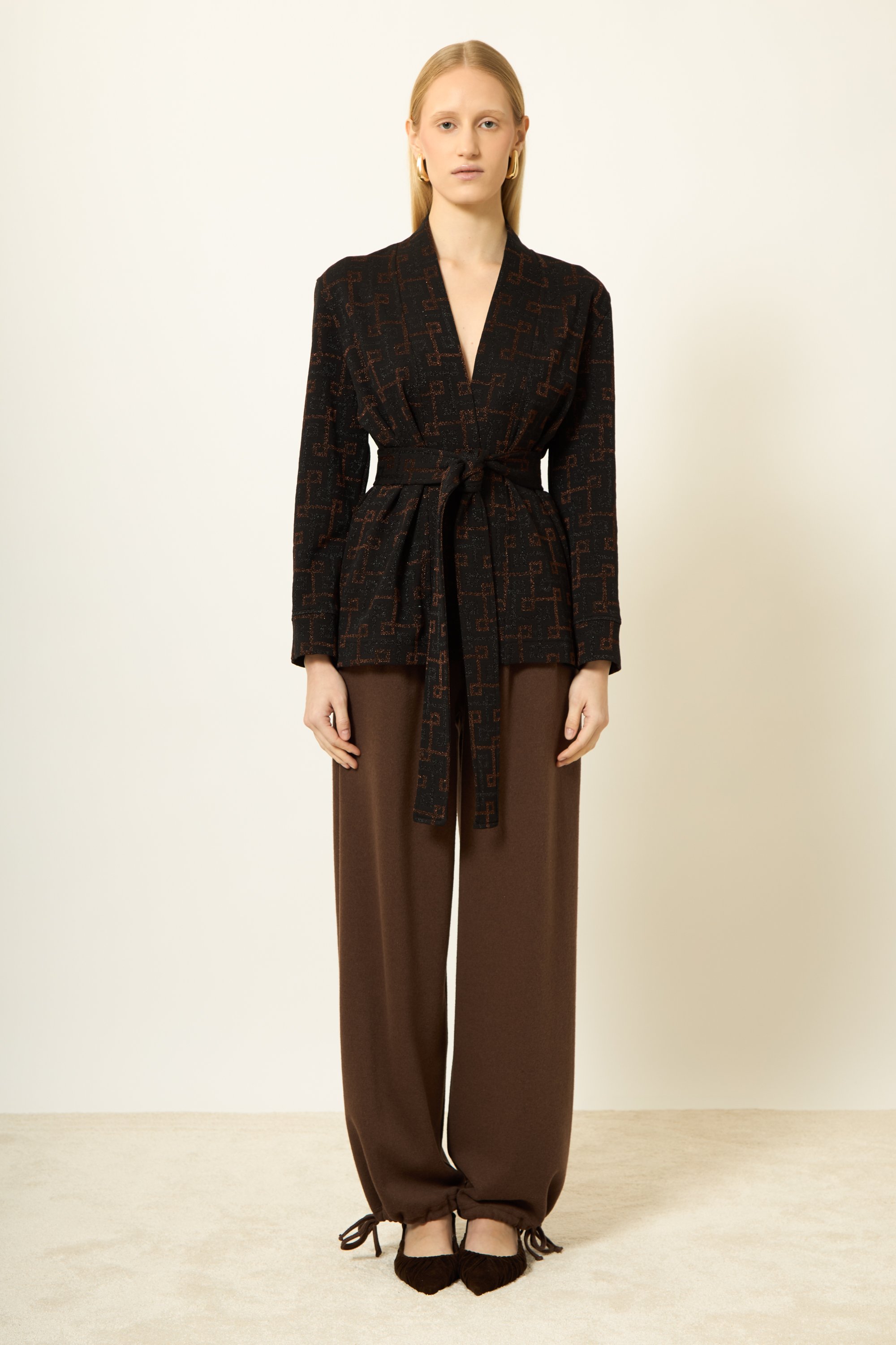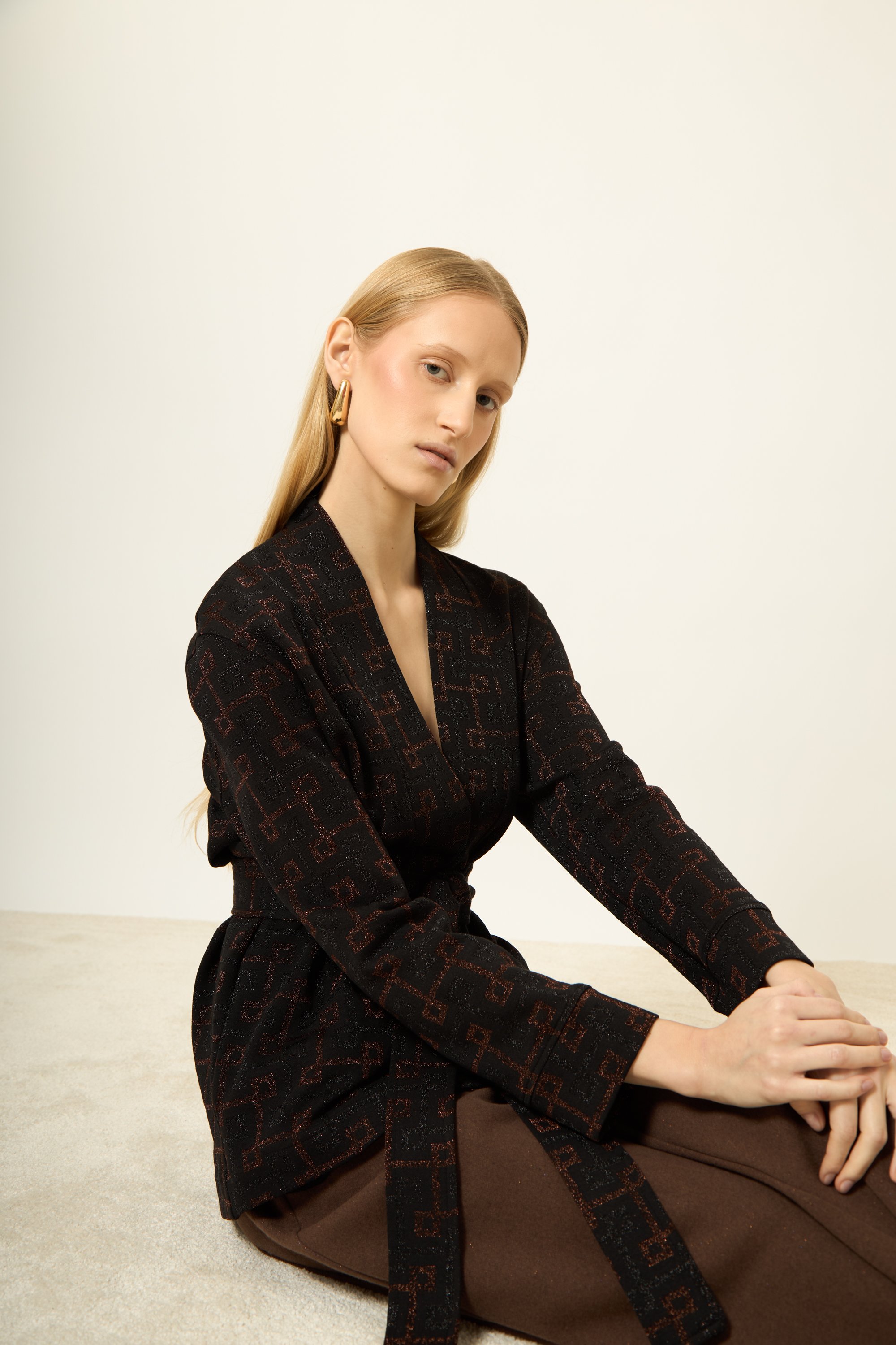 Cardigan con maniche lunghe. Chiusura frontale con cintura. Tessuto jacquard fantasia base COTONE.