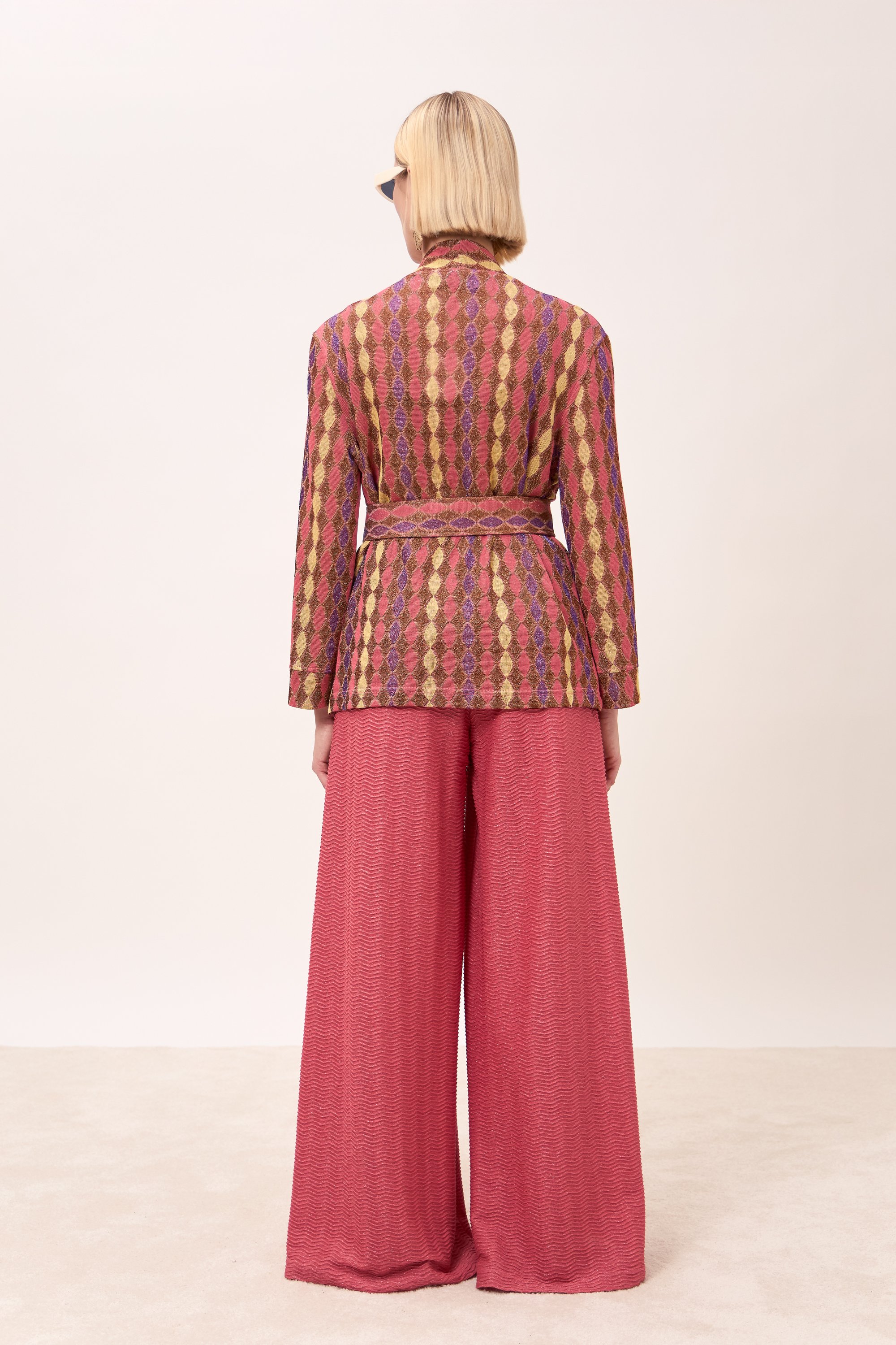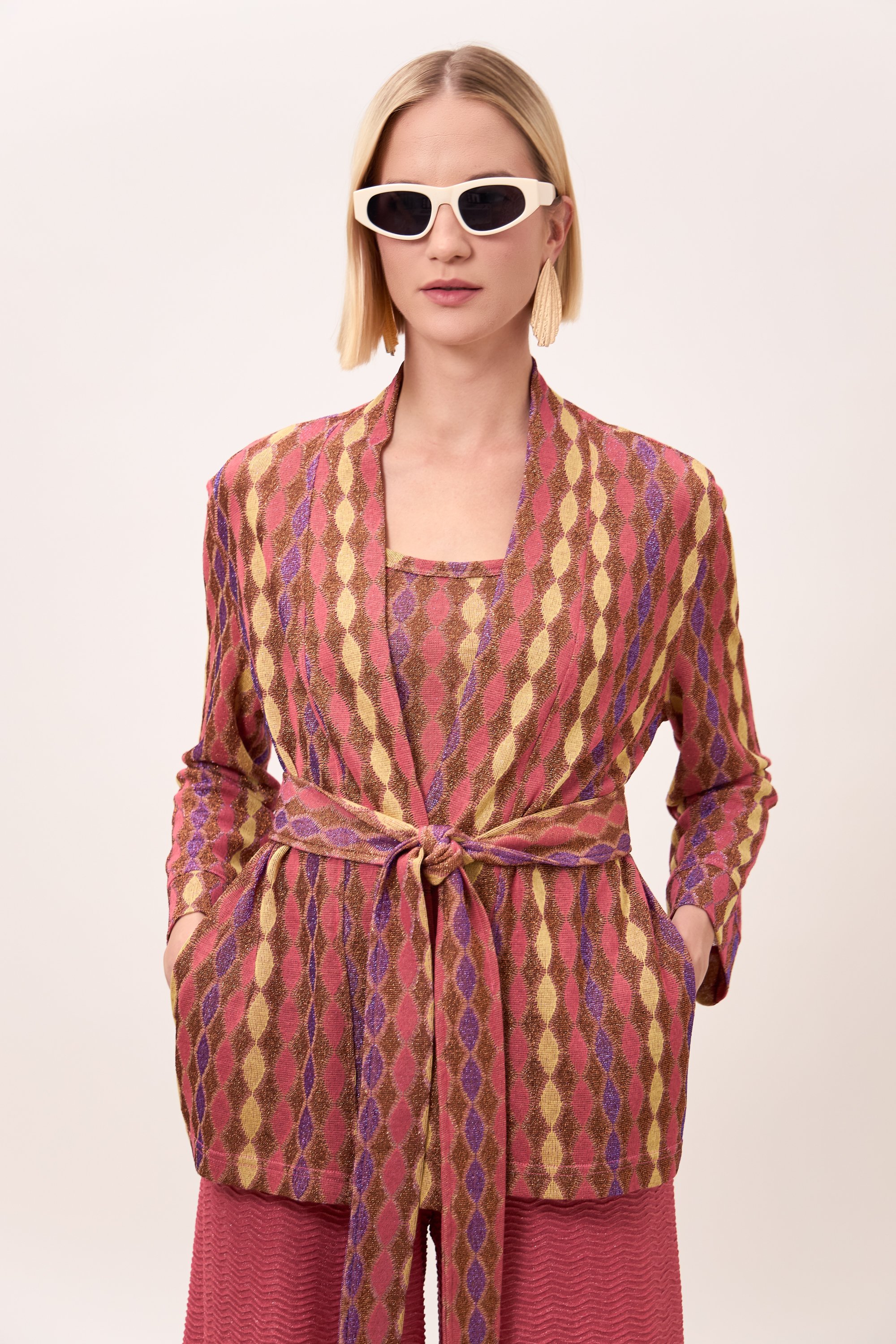 Cardigan corto con maniche lunghe. Chiusura frontale con cintura.