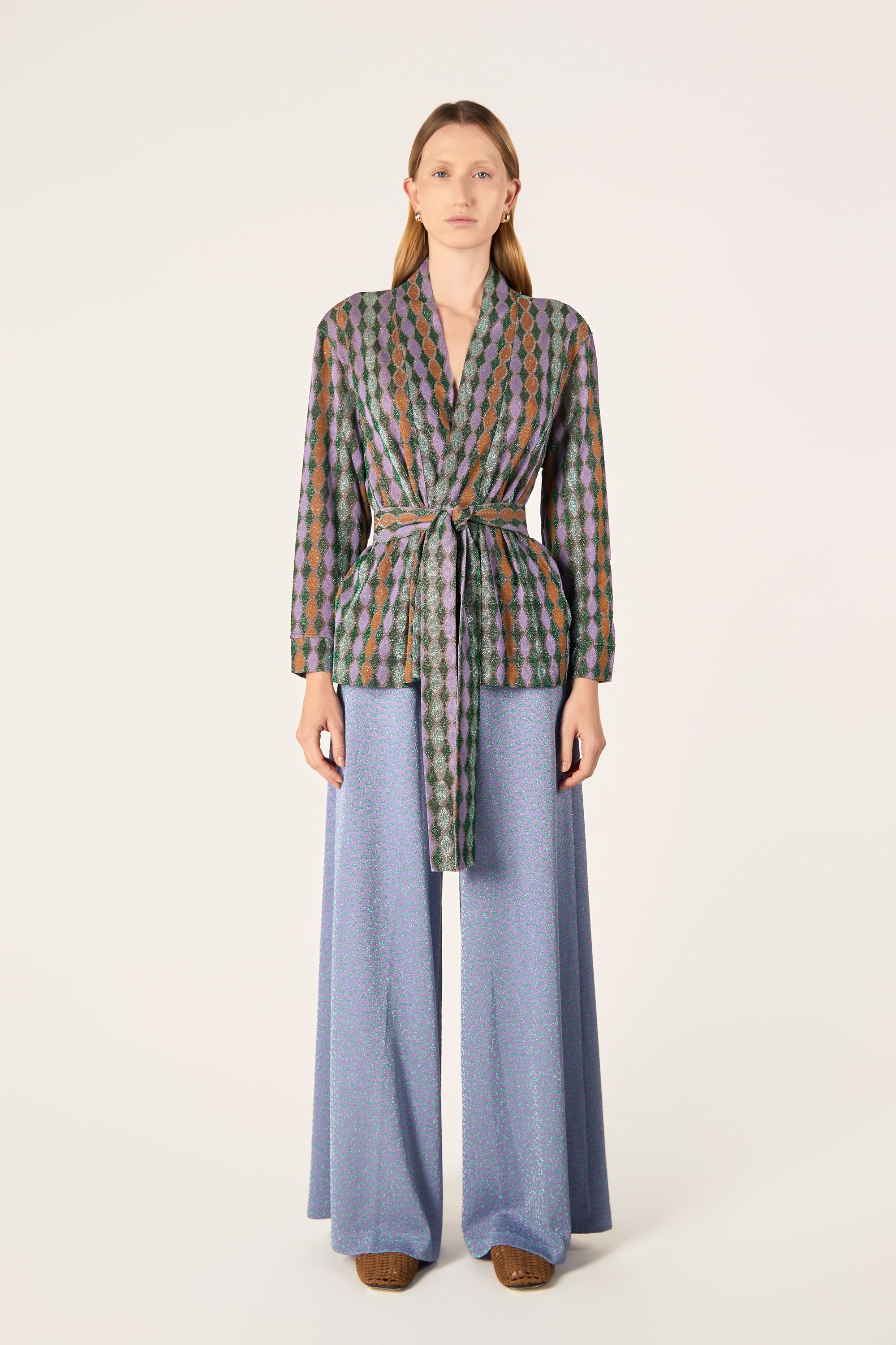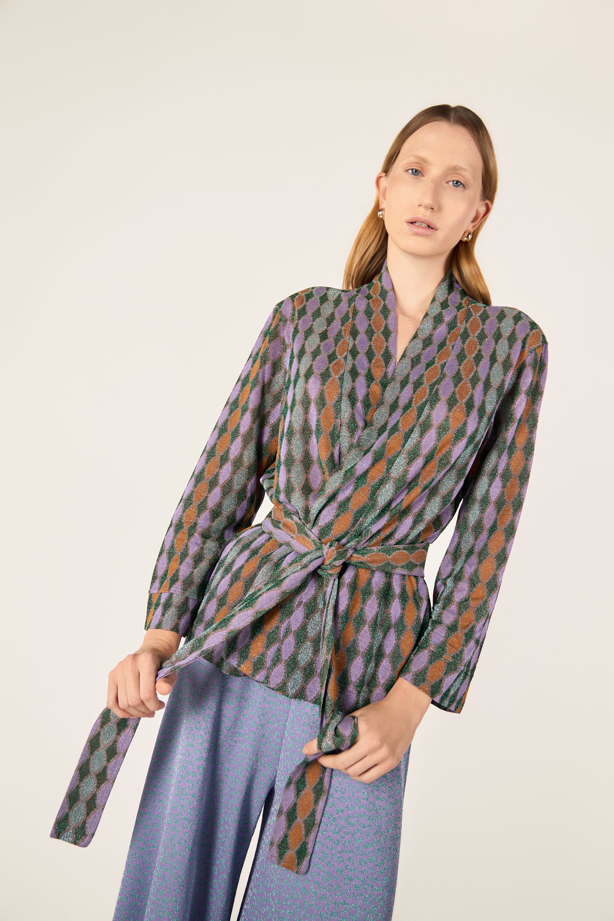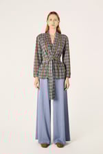 Cardigan corto con maniche lunghe. Chiusura frontale con cintura.