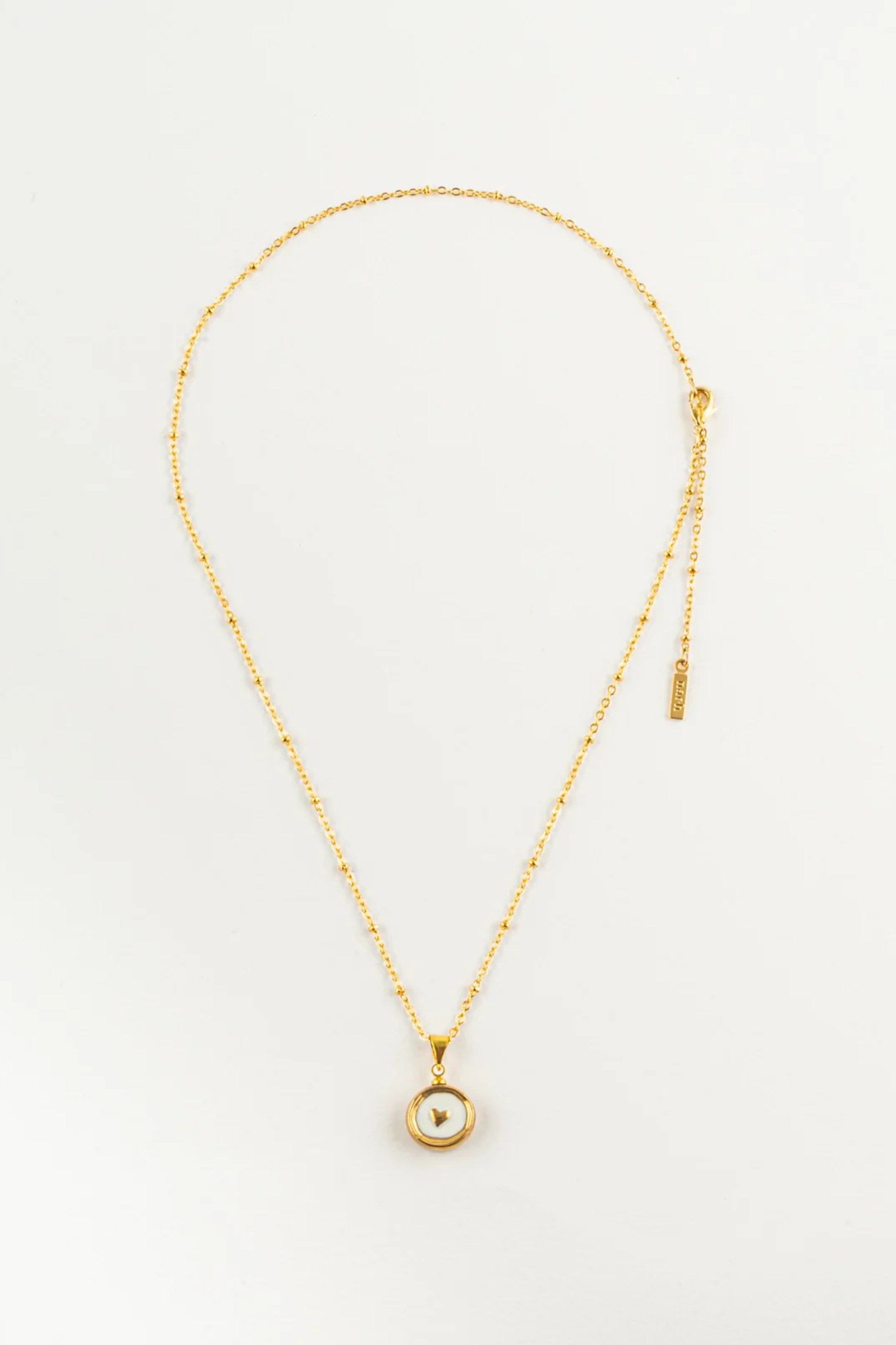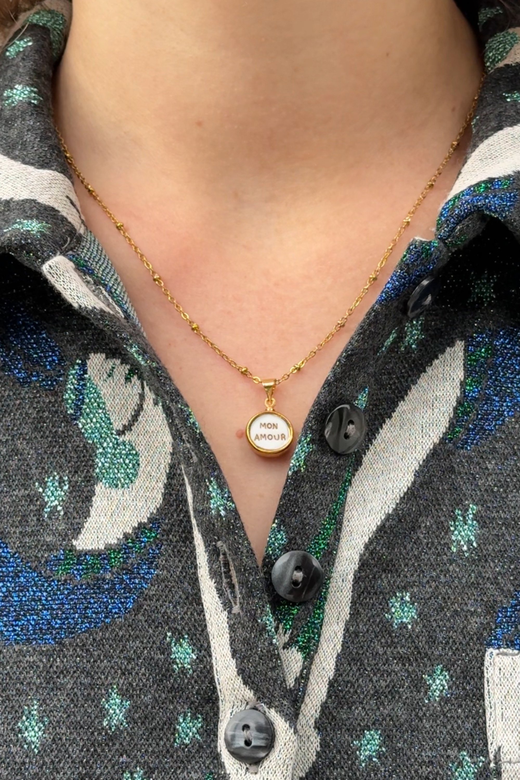 Collana double face in porcellana, perline di vetro e ottone placcato oro fine. Metallo senza nichel e anallergico. La porcellana è realizzata e dipinta a mano. Ogni pezzo è unico e le sue piccole irregolarità gli conferiscono un aspetto autentico e prezioso.