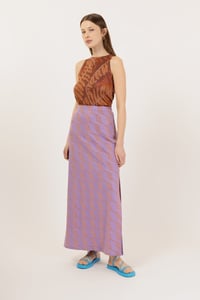 Gonna alla caviglia, aderente con spacco sul lato sinistro. Elastico in vita.