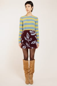 Minigonna svasata con zip invisibile sul fianco. Sfoderata con inserti di fodera in lurex.