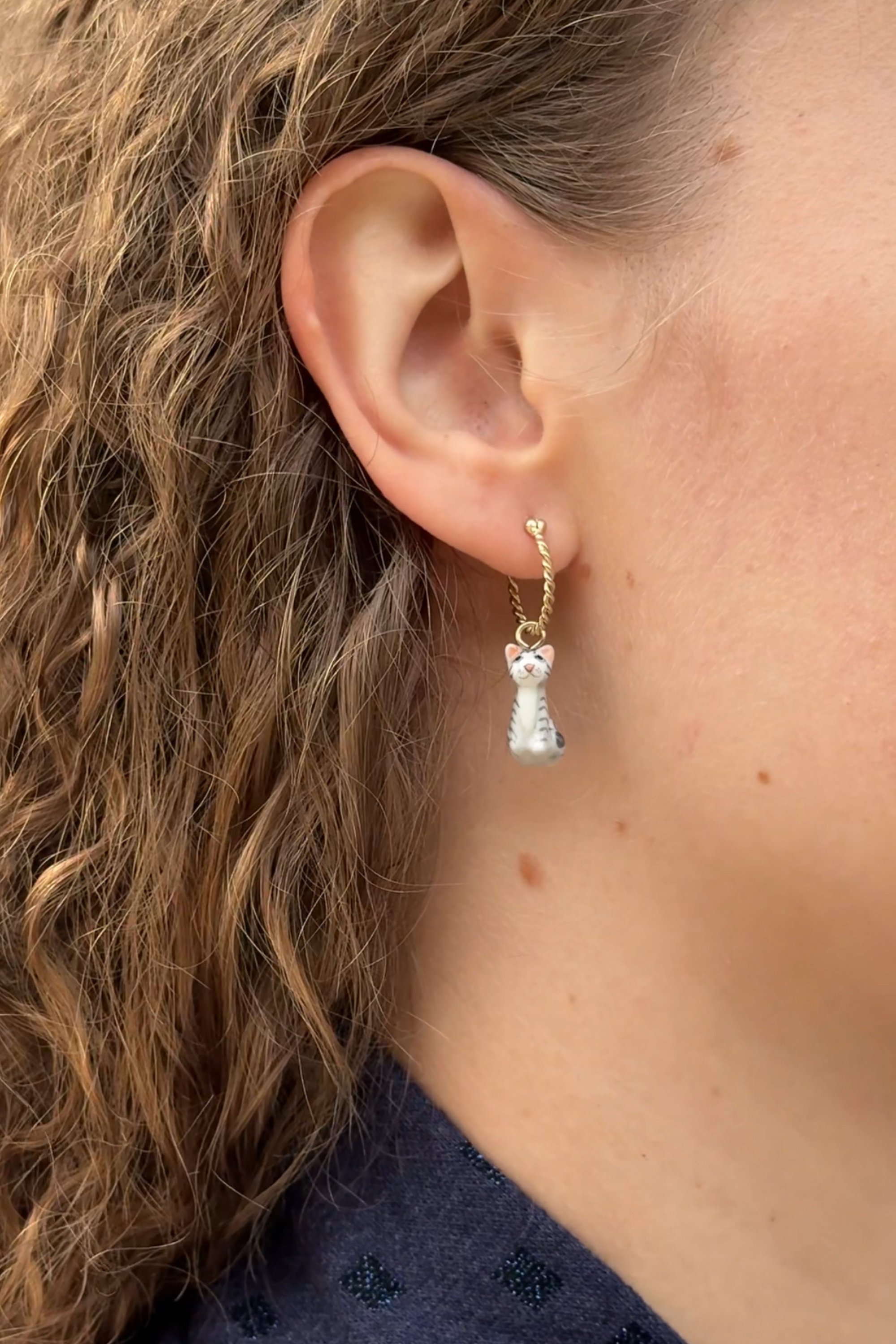 Orecchini in porcellana e ottone dorato con oro fine. Metallo certificato senza nichel e anallergico, proveniente dall’Italia. La porcellana è realizzata e dipinta a mano in modo artigianale, con applicazione di foglia d'oro. Ogni pezzo è unico e le sue piccole irregolarità gli conferiscono un aspetto autentico e prezioso.