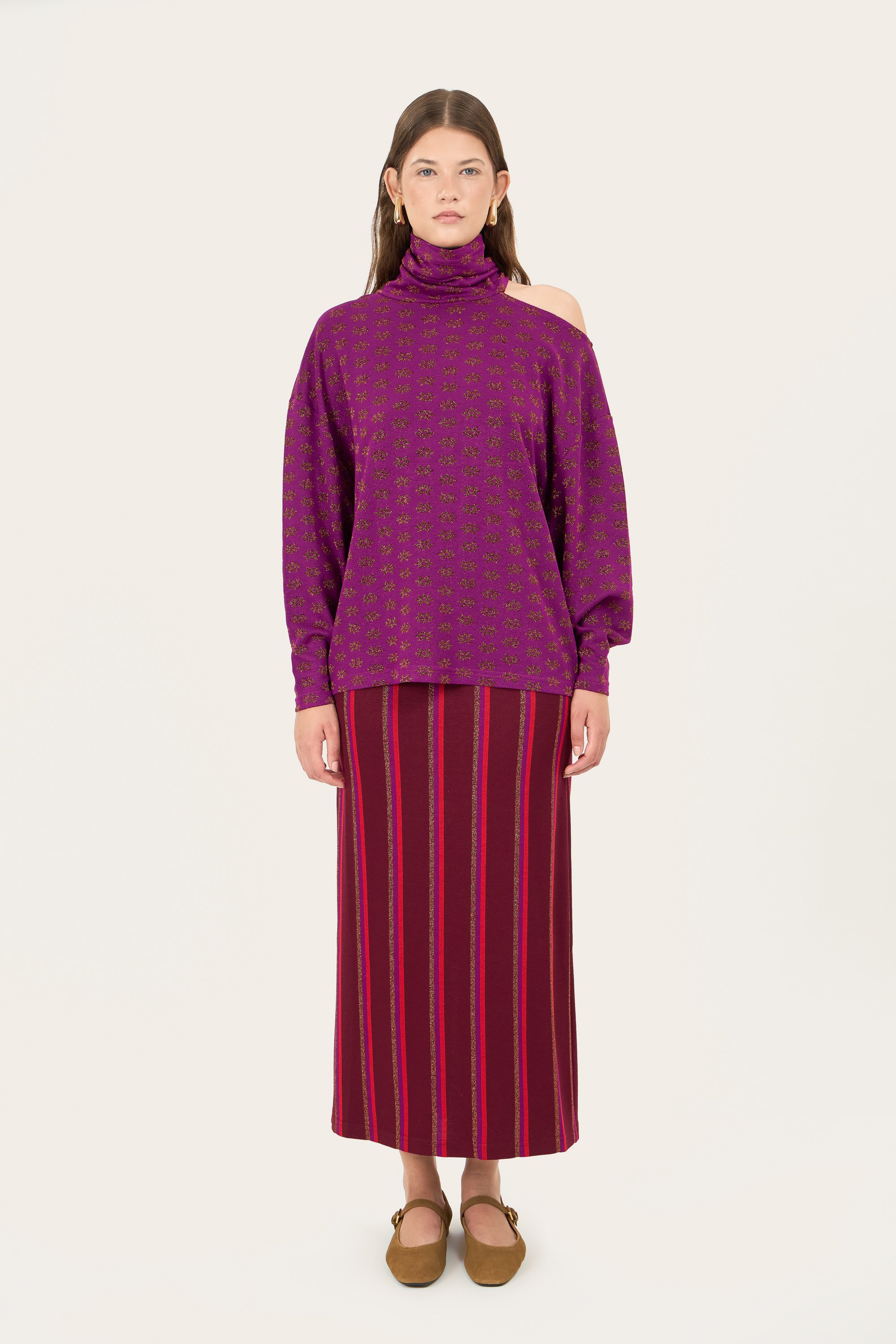 Maglia con collo alto e maniche lunghe. Spalla scoperta.