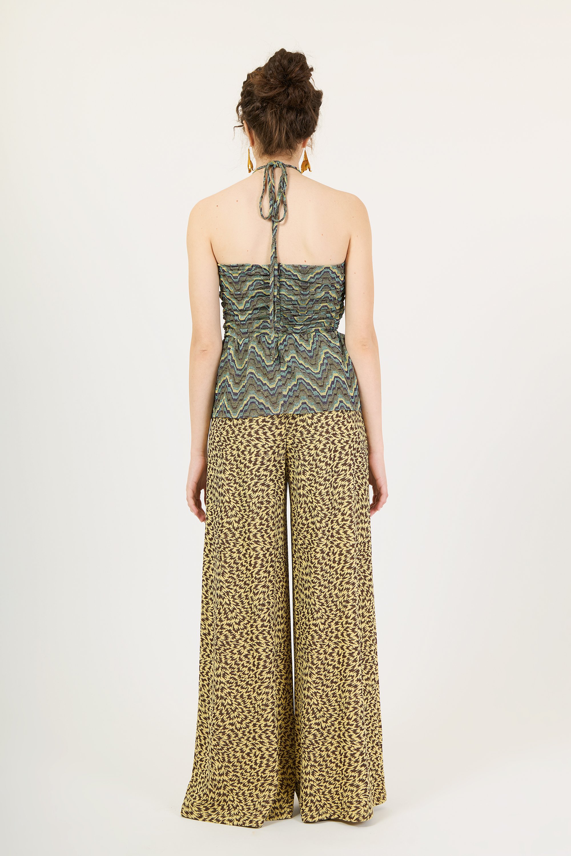 Pantalone palazzo ampio con elastico in vita e gamba svasata.