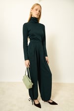 Pantalone con pinces e coulisse sul fondo gamba. Elastico in vita.