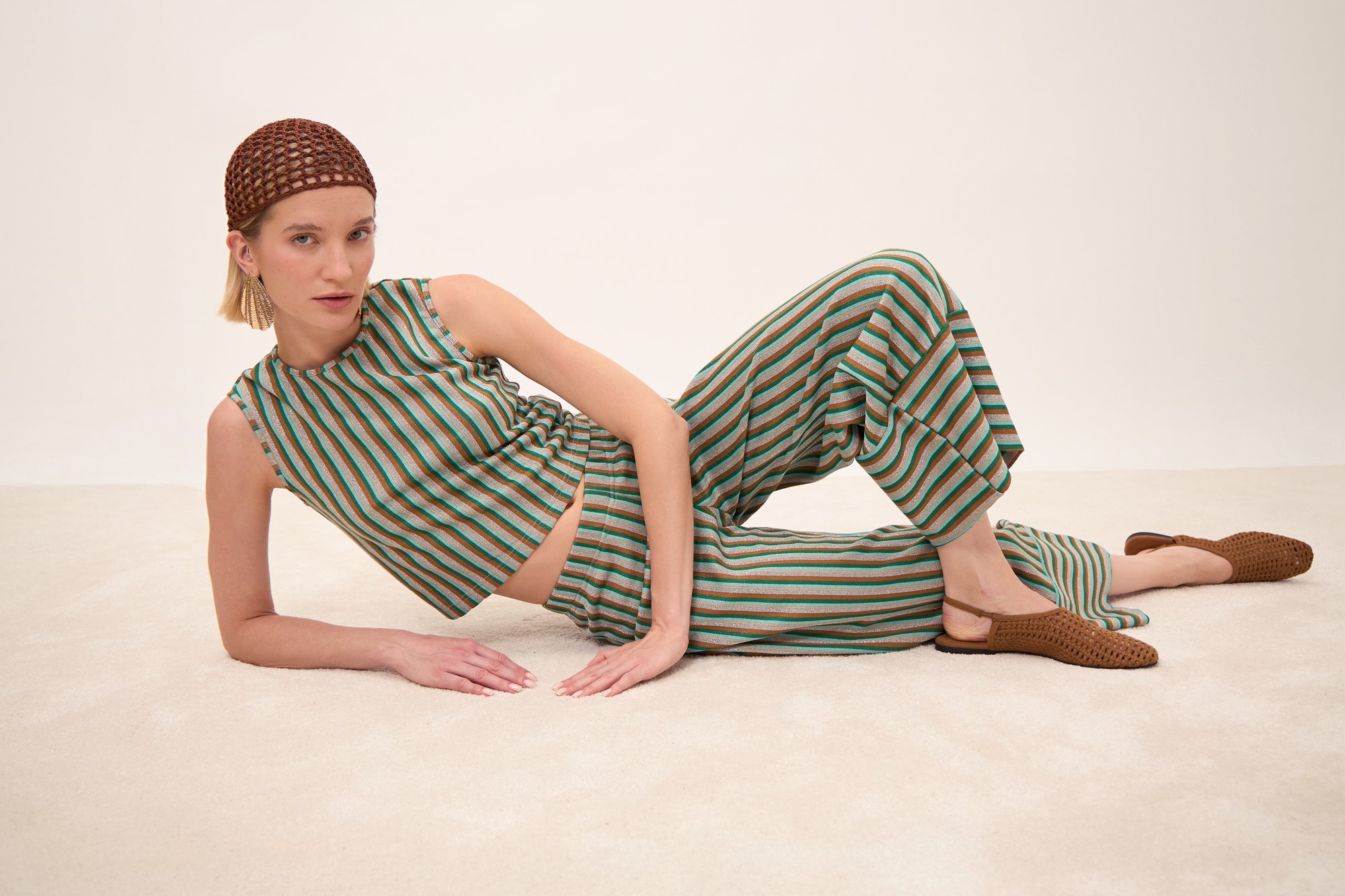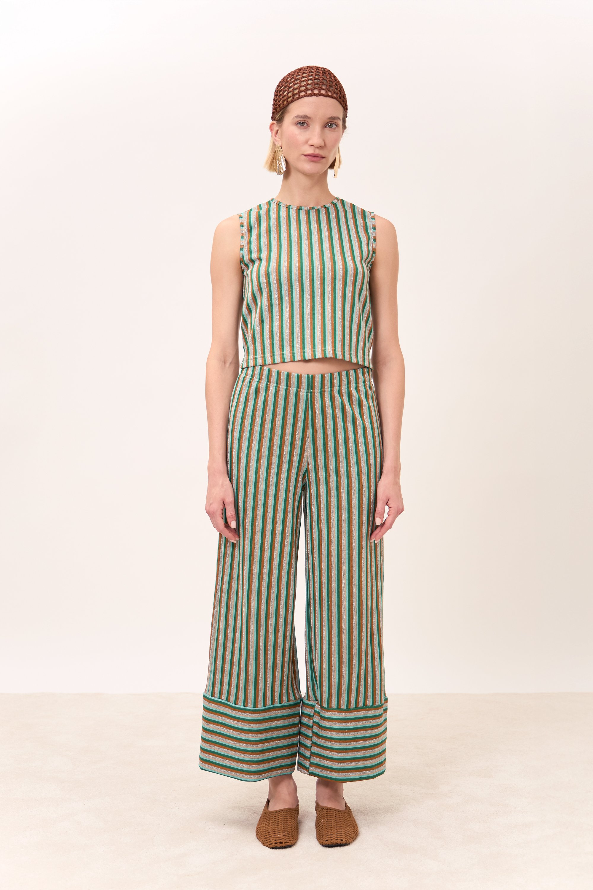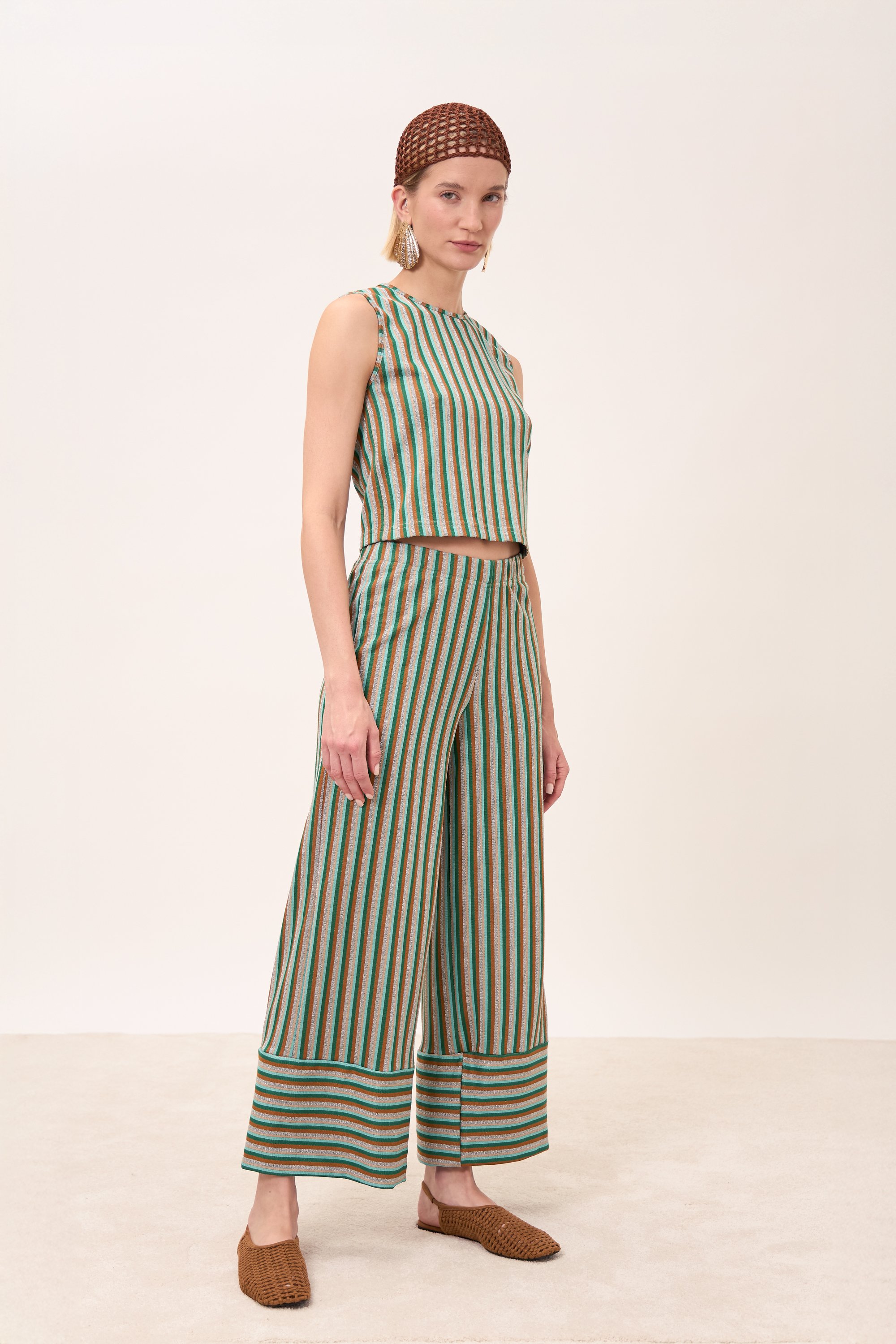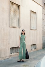Pantalone lungo alla caviglia, gamba larga con tasche quadrate. Elastico in vita.