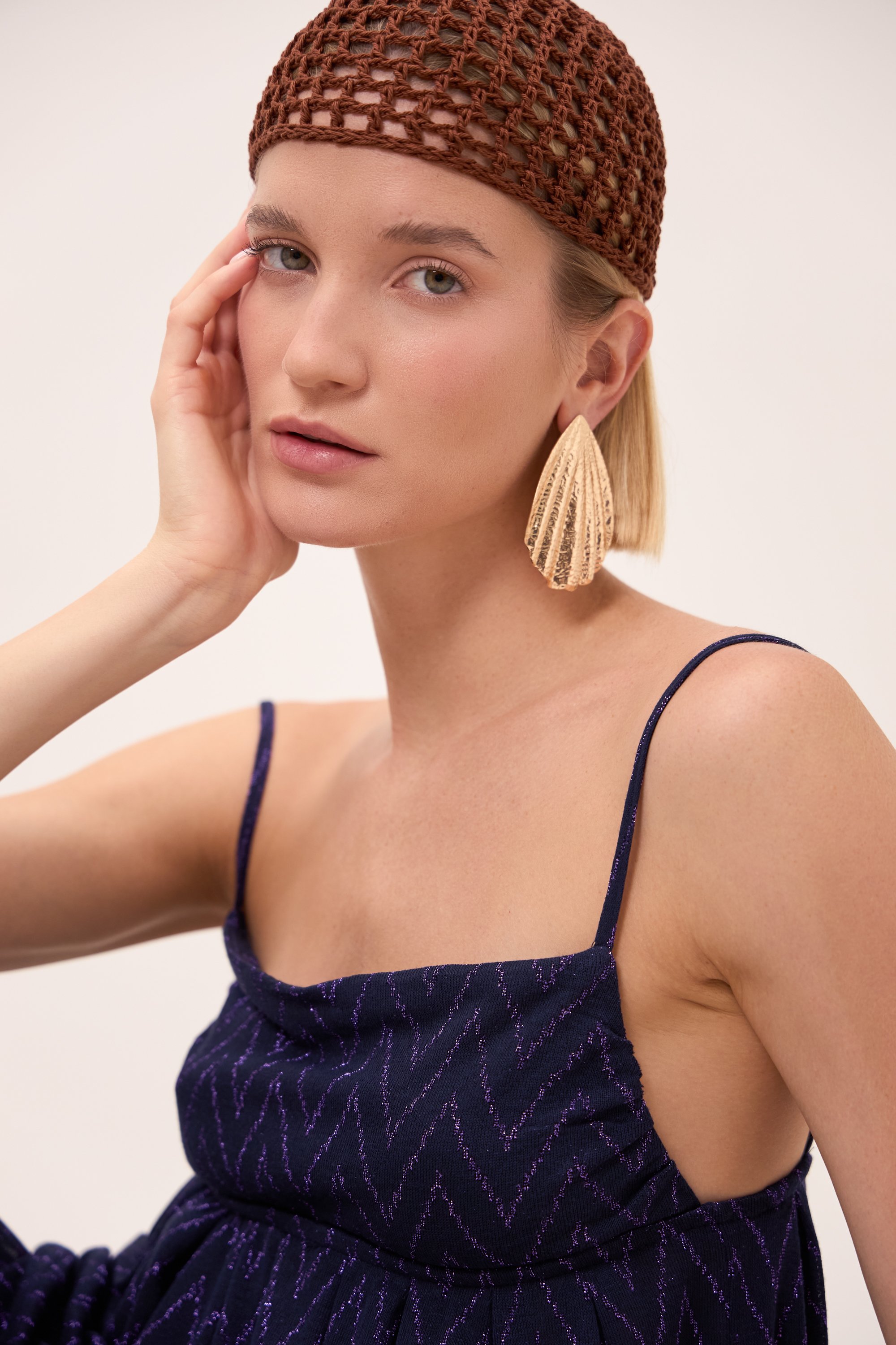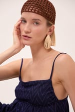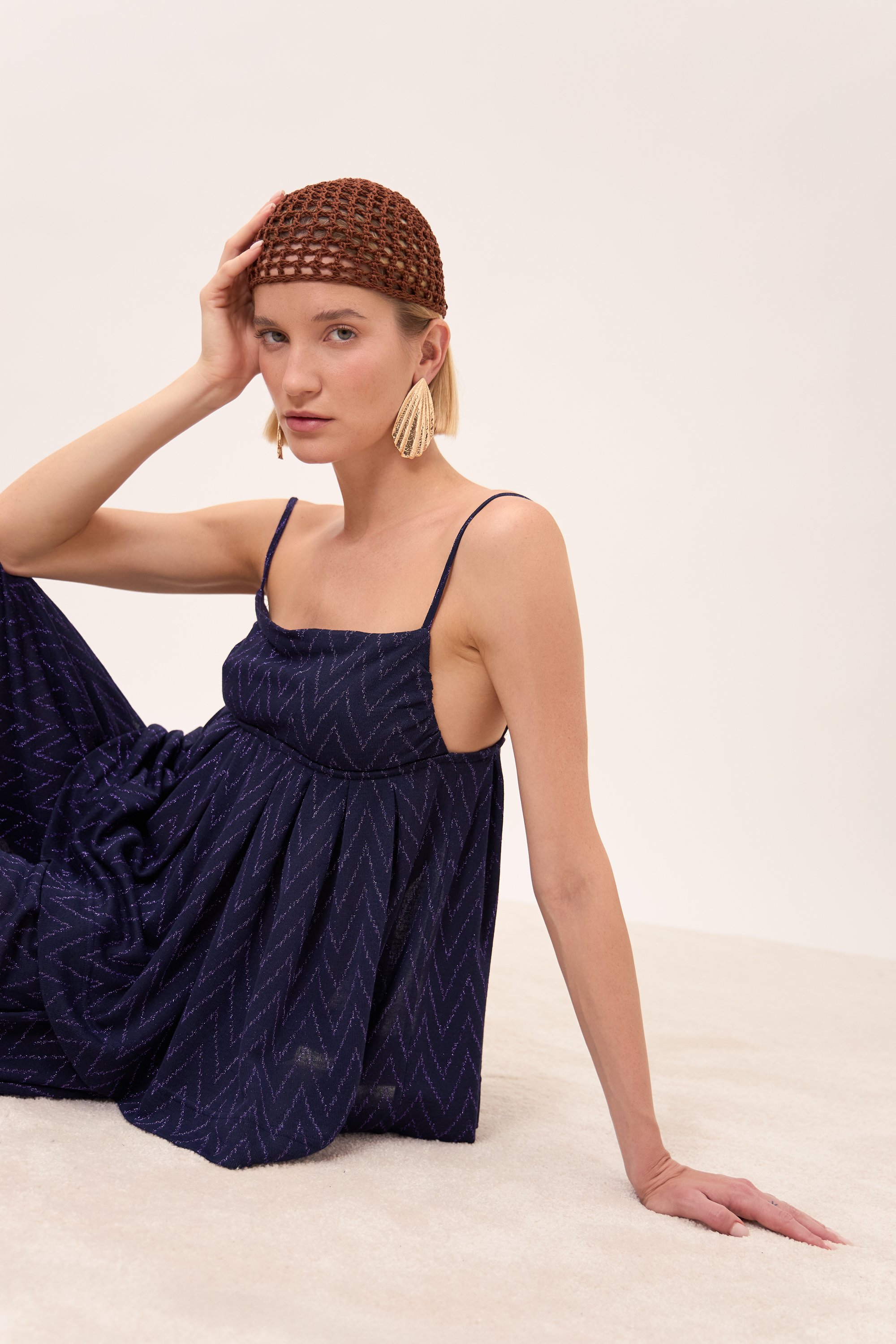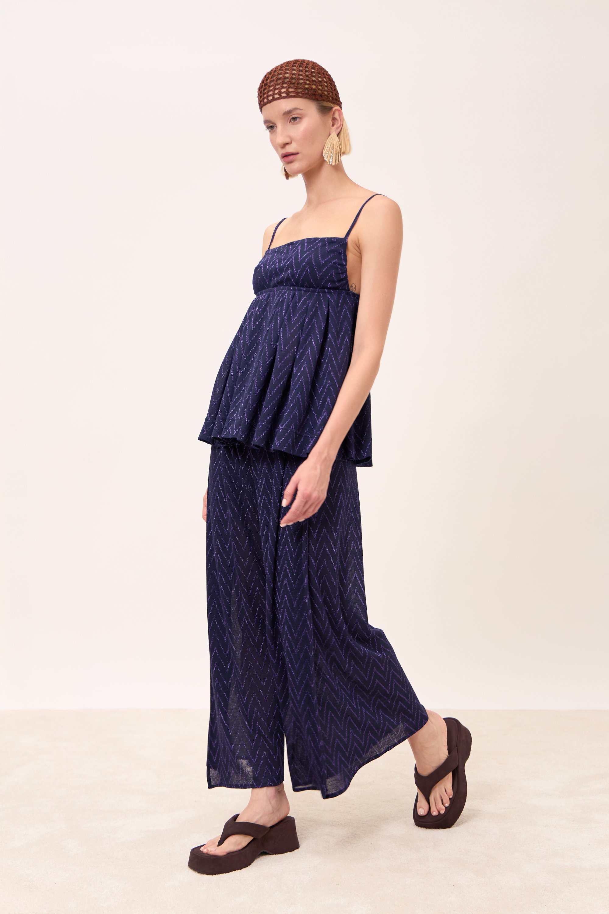 Top spallina sottile con pieghe sotto il seno che creano volume. Scollo dritto.